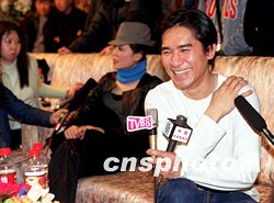 香港影星梁朝偉(右)日前在北京青年宮舉辦的電影《天下無雙》的首映式上接受記者的采訪。中新社記者 史利 攝