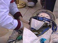 成功返回地球的“神舟”三號飛船返回艙在北京被打開,“模擬宇航員”在經歷數百萬公里的太空旅行后安然無恙,圖為工作人員在檢查“模擬宇航員”。中新社