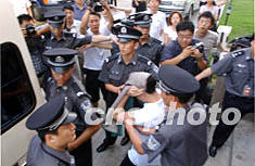 圖:歌星紅豆一審判處三年零六個月 2002年06月20日 17:18 ![]() 猥褻多名男童的青年歌星紅豆二十日在北京朝陽法院被一審判處三年零六個月的徒刑。圖為紅豆在法庭宣判結束后,用衣服捂著頭走上囚車。作者:武仲林