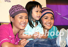 ![]() 樂壇女子組合Twins兩位成員蔡卓妍(右)、鍾欣桐8日1日在香港舉行「愛上色彩之歷險」寫真集簽名會,大批Twins歌迷到場支持偶像,Twins被一位可愛的小女孩吸引合照。鄧慶樂 攝