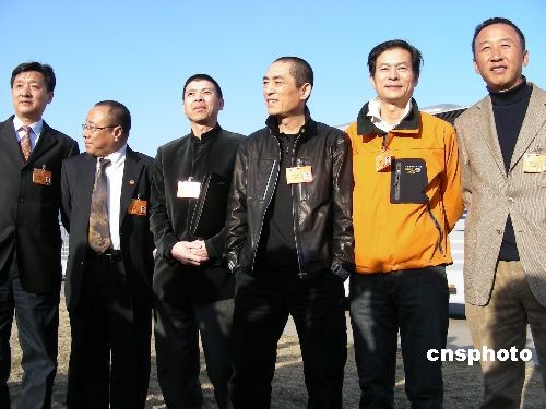 三月三日下午,全國政協(xié)十一屆一次會議開幕會后,著名導(dǎo)演張藝謀委員和他在北京電影學(xué)院的同學(xué)委員們相聚,在大會堂前合影。圖中左起至右分別是:張會軍、尹力、馮小剛、張藝謀、陳國星和馮小寧。其中,張會軍是北京電影學(xué)院院長,其余五人均為中國著名導(dǎo)演。中新社發(fā) 沈嘉 攝