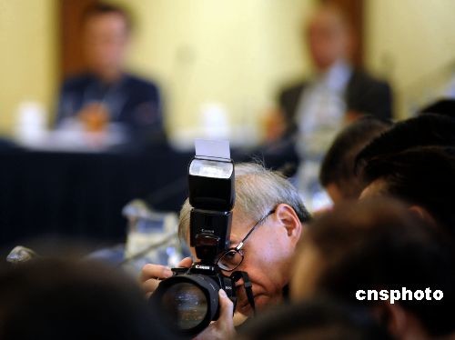 三月四日,全國政協十一屆一次會議進行小組討論常委會工作報告和提案工作情況報告,喜愛攝影的胡經昌委員在香港小組討論中不失時機抓拍會議瞬間。中新社發 廖攀 攝