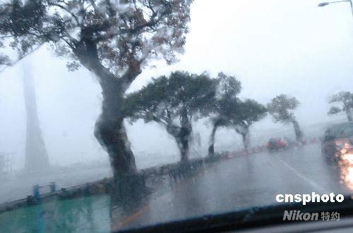 四月十九日,“浣熊”臺風登陸澳門,當地掛起八號風球 ,街面狂風大作,暴雨傾盆,造成碼頭停航,橋梁封路。中新社發 史利 攝