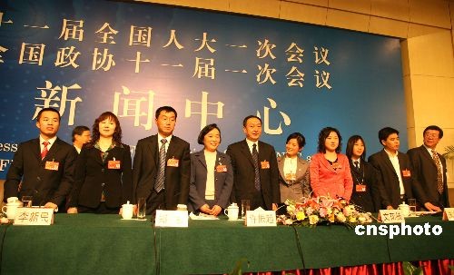 三月六日,十一屆全國人一次會議新聞中心舉行首場集體采訪,十位來自基層的全國人大代表亮相。他們中除一名是導游、一名是教師外,其他均為工人、農民代表。中新社發(fā) 吳慶才 攝