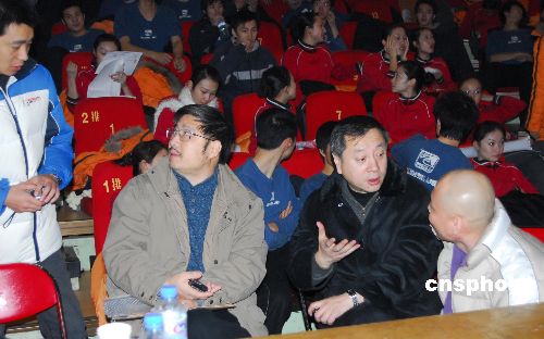 2008年中國農歷春節將近,中央電視臺各類春節檔期的晚會節目進入了緊張的節目審查和彩排階段。文藝中心主任朱彤(前排右二)和春晚總導演陳臨春(前排左二)在彩排現場悉心指導工作。中新社發 楊影懿 攝