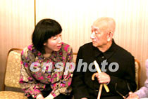 一代圍棋名家吳清源與前中國棋手、現在代表韓國出戰的芮乃偉女士(左),在第十四屆富士通杯世界圍棋冠軍賽抽簽儀式上交談。中新社圖 陶光雄 攝