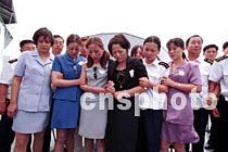 中國海上祭奠“海空衛士”王偉烈士活動,四月二十六日中午在海南省三亞市臨近海域舉行。王偉妻子阮國琴(中)、姐姐王琳(左三)在海軍509號導彈護衛艦甲板上為王偉默哀。中新社圖 張全躍 攝