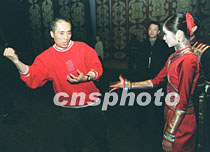 二十六日芭蕾舞劇《大紅燈籠高高掛》的彩排間隙,張藝謀給演員說戲。中新社圖 史利 攝