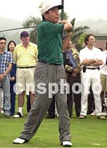 鄭裕彤為比賽試球助興。“2001年澳門高爾夫球公開賽”將于三日開幕,多名世界級的好手云集于此。圖為香港富商鄭裕彤為比賽試球助興。中新社傳真 宗金柱攝