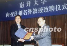 圖文:金庸受聘為南開大學文學院名譽教授 2001年5月28日 10:42 ![]() 著名武俠小說家金庸先生五月二十八日受聘為南開大學名譽教授。圖為南開大學校長侯自新(左)向金庸先生(右)頒發(fā)聘書。中新社記者 孫志民 攝