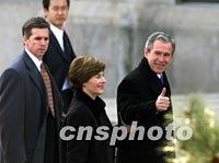 美國總統布什二十一日抵達北京首都國際機場時,向迎接的人們豎起拇指。中新社記者 毛建軍 攝