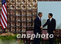 ![]() 中國國家副主席胡錦濤二十二日在北京清華大學聆聽訪華的美國總統布什演講。中新社記者 賈國榮 攝