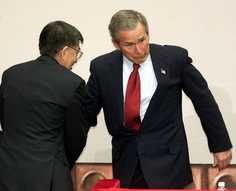 幽默和尷尬——外電報道布什訪華過程花絮(圖) 2002年02月22日 17:08 ![]() 清華校長王大中扶住差點絆倒的布什(美聯(lián)社) 中新網(wǎng)北京2月22日消息:布什對中國的訪問在坦誠和熱情的氣氛中進行,兩國領(lǐng)導人就中美關(guān)系和國際形勢等重大問題進行了重要的會談,而訪問過程中也出現(xiàn)了一些有趣的花絮。 布什遇上兩次小麻煩 據(jù)德新社報道,今天布什座車的輪胎在赴宴途中爆裂,迫使他換乘后面的車輛。當時他剛結(jié)束在清華大學的演講,正趕往北京市中心的中南海與江澤民主席共進午餐。布什被迫放棄自己的豪華轎車,但是沒有延誤他與江主席的會晤。爆胎是美國總統(tǒng)今天遇上的第二次尷尬。 此前,布什在清華大學的演講贏得了兩三百名學生的熱烈掌聲,但是提問環(huán)節(jié)結(jié)束后,他在走過講臺準備與中國官員握手時腳底絆了一下。布什顯然試圖化解這一尷尬場面,順勢做了要與一名中國官員擁抱的樣子。 清華演講不乏幽默 美國的《紐約時報》的報道說,布什在中國高等學府清華大學的演說時有幽默之處。在提問環(huán)節(jié),布什的中文譯員最開始居然準備把總統(tǒng)的回答翻譯成她自己“出色”的英語。布什笑著說:“她在糾正我的英語。” 還有一次,一名學生問布什是否鼓勵自己的雙胞胎女兒來中國學習。布什再次笑答:“恐怕她們不再聽我的話啦,如果你明白我的意思的話。”