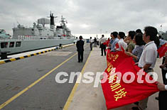 圖:中國海軍環球航行訪問艦艇編隊抵達新加坡 2002年05月23日 19:07 ![]() 由“青島號”艦、“太倉號”艦組成的中國海軍首次環球航行訪問艦艇編隊,五月二十三日上午抵達新加坡海軍基地樟宜港,開始對新加坡進行為期3天的友好訪問。這是中國人民海軍艦艇編隊首次對新加坡進行友好訪問。中新社圖 躍勝岐 攝