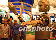 圖:國(guó)產(chǎn)音樂(lè)迎賓機(jī)器人亮相 2002年05月26日 11:02 ![]() 一位國(guó)產(chǎn)音樂(lè)迎賓機(jī)器人,在五月北京國(guó)際科技產(chǎn)業(yè)博覽會(huì)上亮相,它能指揮許多中外名曲向來(lái)賓致意。賈國(guó)榮 攝