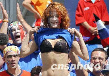 圖:法國(guó)瘋狂女球迷看臺(tái)上掀起上衣 2002年06月11日 14:38 ![]() 6月11日下午,韓日世界杯A組丹麥隊(duì)與法國(guó)隊(duì)的比賽在韓國(guó)仁川文鶴體育場(chǎng)進(jìn)行,圖為法國(guó)瘋狂女球迷看臺(tái)上掀起上衣。