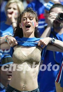 世界杯足球賽A組法國對丹麥的比賽十一日在韓國仁川舉行,圖為狂熱的法國女球迷。毛建軍 攝