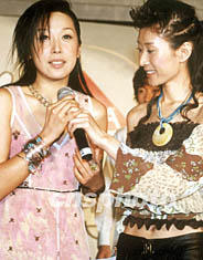 日前,2002MTV-萊卡風尚頒獎大典在北京王府飯店舉行。圖為獲獎歌手孫悅(左)和著名節目主持人李霞在發布會上。錢興強 攝