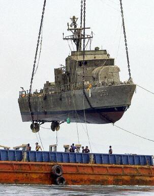 據(jù)韓國聯(lián)合通訊社報(bào)道,韓國海軍海難援救隊(duì)今天利用大型海上吊車,成功地將24-27米海底深處的沉沒艦艇起吊到一艘駁船上。這艘艦艇將被運(yùn)到平澤第2艦隊(duì)司令部基地接受船體檢查。