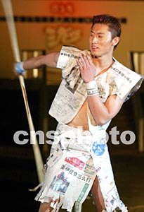 一名中國內地男模展示自己用報紙制作的個性時裝,別開生面。毛建軍 攝