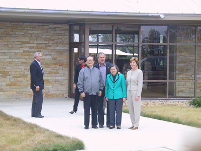 當(dāng)江澤民和夫人王冶坪乘專車抵達(dá)牧場正門口時(shí),提早迎候在那里的布什總統(tǒng)和夫人勞拉走向前去,與江澤民夫婦熱情握手。布什說,這個(gè)牧場是我溫暖的家,我和勞拉非常高興在家里接待你和王冶坪女士。