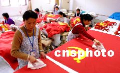 隨著黨的十六大的臨近,社會對黨旗的需求量也隨之大增,北京京工紅旗廠很多職工都放棄了雙休日加班趕制黨旗。蔡代征 攝