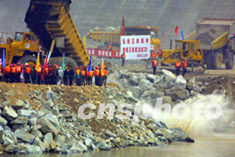長江三峽工程導流明渠截流,六日上午在國務院副總理吳邦國一聲令下開始合龍。作者:宋吉河