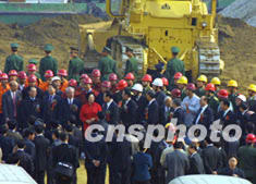 全國人大常委會委員長李鵬六日到長江三峽導流明渠截流工地看望工人,并與工人們合影留念。作者:宋吉河
