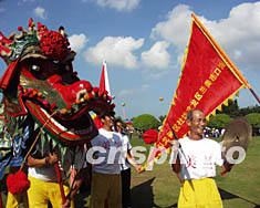 街道路邊椰樹上掛著紅燈籠和慶祝十六大閉幕的紅色標語。下午二時,海口最大的綠化公園早已人山人海,鼓號陣陣,海口人民懷著無比激動的心情,在這片草地上載歌載舞,用舞龍、舞獅、秧歌、扇舞、竹竿舞、腰鼓、軍樂、太極拳等方式,表達他們喜悅的心情。