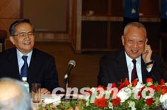 香港特區第十屆全國人大代表選舉會議主席團,十一月二十五日在香港舉行會議,確認七十八位候選人。香港特首董建華與全國人大常委會秘書長何椿霖(左)出席該會并聽取參選情況匯報。潘索菲攝