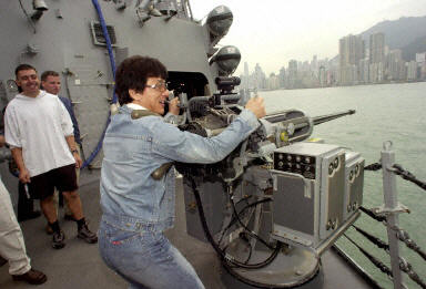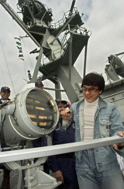 身在香港拍電影的成龍,日前應美國海軍導彈驅逐艦逾百名船員邀請,到艦上參觀。成龍身穿牛仔服,架上墨鏡,一早便在添馬艦登艦,受到船員熱情款待。成龍也表現得十分雀躍。圖為成龍在機槍前作狀開槍掃射。