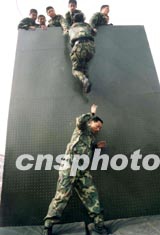 解放軍總參一支野戰通信部隊,日前進行攀登高墻訓練。這項訓練科目要求,十名戰斗員要在一分鐘內完成四米高墻的翻越。作者:馬新剛