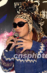 歌星陳奕迅1月7日悉心打扮出席香港的「松日Matsunichi MP3 THIRD ENCOUNTER陳奕迅演唱會」記者招待會,他的歌曲「明年今日」剛奪得勁歌金曲金獎,圖為陳奕迅在記招上手舞足蹈難掩喜悅心情。鄧慶樂 攝
