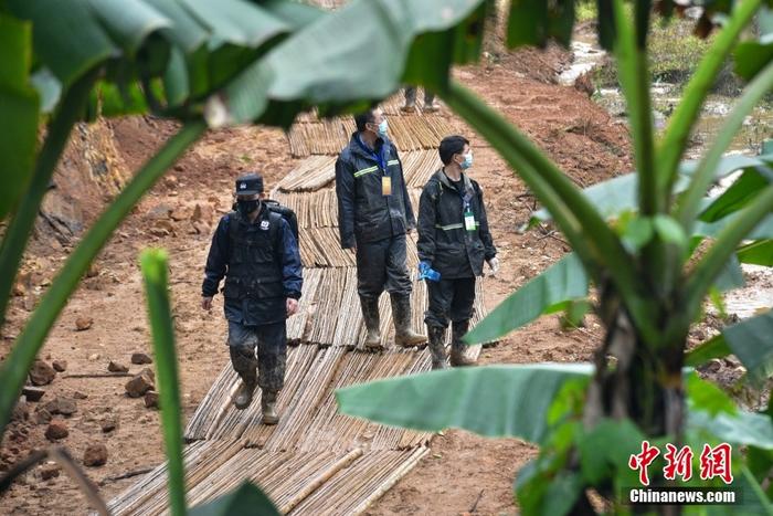 墜機(jī)事故現(xiàn)場(chǎng)下雨 工作人員鋪設(shè)竹排小道