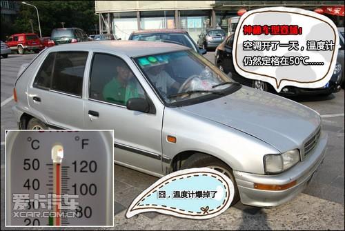 最后我們的神秘車型終于要登場了,剛鉆進車子就感覺到一股熱浪,再看溫度計,已經死死地定格在50度,估計溫度想往上飆也只恨刻度太少不能表現了,打開空調的冷風,怎么感覺都是熱風吹來?