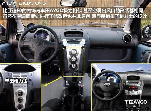 比亞迪F0是目前非常受歡迎的微型車之一,可愛靚麗的造型尤其吸引年輕人的目光,在整個微型車領域中的銷量也是名列前茅,當然這與它親民的售價也是分不開的,然而它俊俏的外表和可愛的內飾卻與豐田旗下的兩款車有著極度的相似。