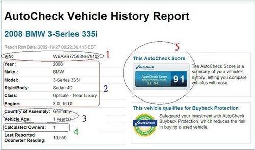 AutoCheck report與美國(guó)部份州的監(jiān)理所(DMV)有合作關(guān)系,因此如果您上美國(guó)監(jiān)理所(DMV)的網(wǎng)站,監(jiān)理所都會(huì)建議您在買車的時(shí)候,一定要檢查AutoCheck報(bào)告,在AutoCheck報(bào)告可能可以提供您買車的重要參考資料-如經(jīng)歷多少任車主,里程數(shù)為何,何時(shí)何地掛牌,是否有出過交通事故,車籍資料是否干凈(如Lemon car, Salvage or Junk title),等等歷史資料。另一份也一定要了解的是CarFax。