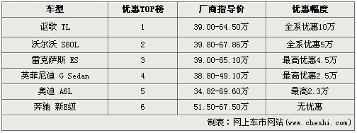 要說寶馬全新一代5系LI車型的上市撼動整個中級車市場,這樣的說法絕對不算嚴重。同級別車型都沒閑著,紛紛打出降價牌。排行榜中高居榜首的是本田的高端品牌謳歌TL車型,以全系優惠10萬元的巨大幅度拔得頭籌;中間分列二三四五位的是沃爾沃S80L:全系優惠5萬、雷克薩斯ES:最高優惠4.5萬、英菲尼迪G系列:最高優惠2.5萬、奧迪A6L最高優惠2.3萬。唯一一款沒有降價的車型是奔馳剛剛上市才不久的國產新E級,全系沒有優惠政策,購車需預定。