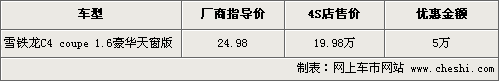 據(jù)4S店銷售人員介紹,目前銷售的C4轎跑車只有頂配1.6豪華天窗版,店內(nèi)有銀色和紅色現(xiàn)車供應(yīng),數(shù)量有限。頂配版原來(lái)廠商指導(dǎo)價(jià)格為24.98萬(wàn)元,現(xiàn)在售價(jià)僅為19.98萬(wàn),直降5萬(wàn)元現(xiàn)金,車價(jià)不足20萬(wàn)元。