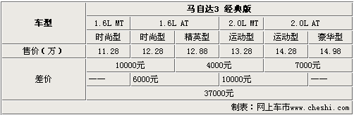 長安馬自達馬3經典版1.6L排量車型共有3款車型,由于外觀、內飾和舒適豪華配置的差異,這3款車的最高差價為6000元。而長安馬自達馬3經典版1.6L手動時尚型和2.0L自動豪華型除配置差異外,動力性能也存在一定的差距,所以差價高達3.7萬元。