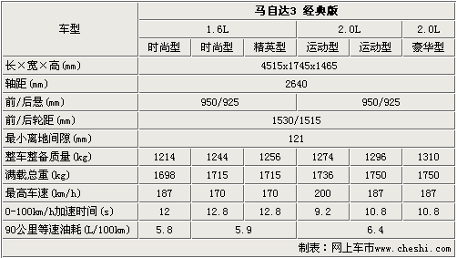 馬3經典版全系車型的車身尺寸達到了4515 X 1745 X 1465mm;雖然這款車采用了更加運動的前臉,但是車身尺寸較老款車型并沒有變化,而且這款車的離地間隙為121mm,比較適應國內的復雜路況。由于排量的不同,這六款車的加速時間也有所區別,其中1.6L自動擋車型的加速時間為12.8秒,2.0L手擋車型的加速時間為9.2秒。