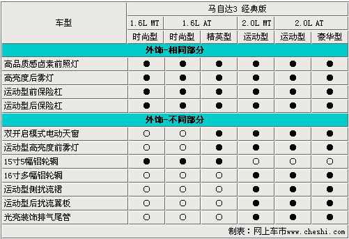 廠家為了區分各車型之間的差異,往往體現在車身外形設計上。馬3經典版的2個系列車型在外觀上的差別也比較明顯,其中2.0L車型配備車身運動包圍、運動型后擾流板、光亮裝飾排氣管等運動套件。 值得一提的是,除兩款低配車型以外,其余四款車型均配備了雙開啟電動天窗和高亮度前霧燈,這兩項配置可以說是新馬3經典版增配中的一個亮點。