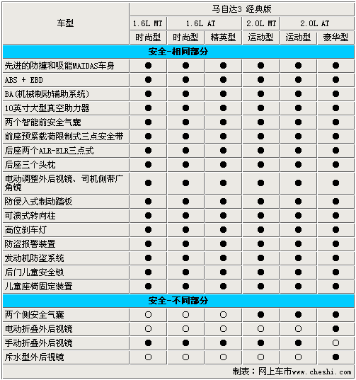 新馬3經典版無論是1.6排量車型還是2.0排量車型,在安全配置方面均比較到位的。ABS+EBD、前排雙氣囊、可潰式轉向柱等主被動安全系統都可以在這款車內找到。不過2.0L車型配前排側氣囊,保證了消費者的安全性,也是一項很人性化的配置,2.0L頂配版車型還配備了電動折疊外后視鏡和斥水型外后視鏡。