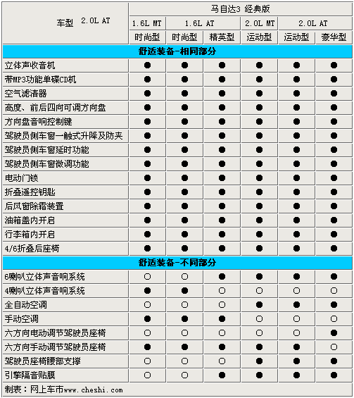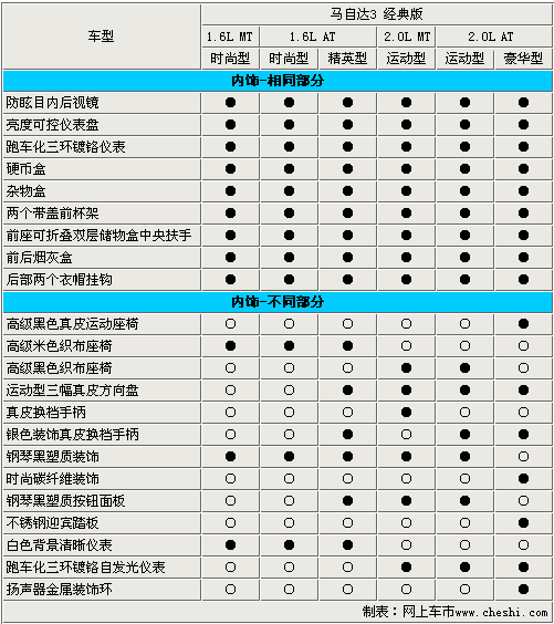 長安馬自達旗下的新款三廂轎車——馬自達3經典版于6月21日正式上市,售價為11.28萬-14.98萬。這款分別搭載1.6L引擎和2.0L引擎的新車,由于配置和動力差異共分為6款車型。其中1.6手動時尚型和1.6自動時尚型的差價為1萬元,而低配車型和2.0自動豪華版車型的差價高達 3.7萬元,那么它們之間到底有著怎樣的配置差異呢?