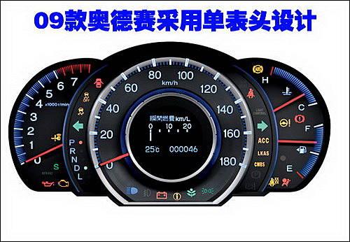 09款?yuàn)W德賽的儀表盤采用了新穎單表盤設(shè)計(jì),轉(zhuǎn)速表、水溫表分列主表盤兩側(cè)。這款自發(fā)光儀表盤能保證消費(fèi)者在夜間行駛時(shí),可以清晰的了解愛車狀況。