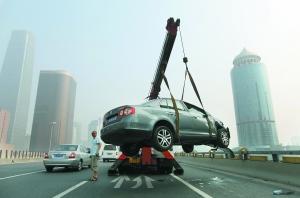 吊車(chē)將事故車(chē)輛吊起。昨日上午7時(shí)30分許,兩輛轎車(chē)在東三環(huán)主路國(guó)貿(mào)橋上發(fā)生碰撞,一輛轎車(chē)仰翻,事故造成1人輕傷。該路段堵塞近半個(gè)小時(shí)。本報(bào)記者 薛珺 巴士廣 攝影報(bào)道