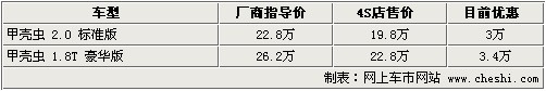 據4S店銷售人員介紹:目前甲殼蟲硬頂版本車型共有2款,2.0升與1.8T車型店內均有現車,2.0升車型目前顏色較為齊全,有綠色、紅色、米色、黑色、藍色車款,最高可優(yōu)惠3萬元,1.8T車型指導價改為26.2萬元,優(yōu)惠后僅為22.8萬元。