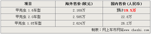 甲殼蟲在海外市場(chǎng)配備1.6、2.0和1.8T三個(gè)排量的多款車型,而甲殼蟲1.6作為入門級(jí)車型,其售價(jià)也最便宜。目前甲殼蟲在國(guó)內(nèi)僅有2.0和1.8T兩個(gè)排量,雖然廠家指導(dǎo)價(jià)為22.8萬和26.2萬,但實(shí)際市場(chǎng)售價(jià)均可優(yōu)惠3萬元左右。通過國(guó)內(nèi)外相同排量車型的售價(jià)可以看出,甲殼蟲1.6引入國(guó)內(nèi)的售價(jià)預(yù)計(jì)為19.5萬元左右。