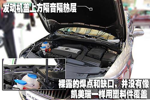 斯柯達昊銳的發(fā)動機艙布局也是比較整齊,位于發(fā)動機蓋上方的隔音隔熱層非常厚實面積也很大。但是記者注意到在前翼子板內(nèi)側(cè)制造中留下的工藝孔并沒有像凱美瑞一樣用塑料件覆蓋。
