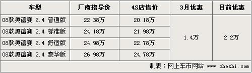 據(jù)北京地區(qū)廣州本田4S點(diǎn)銷售人員表示,目前銷售的08款奧德賽降幅又出現(xiàn)了新的優(yōu)惠幅度。3月份左右,奧德賽全系優(yōu)惠到了1.4萬元,而目前增加到了2.2萬元,直接增加8000元,最低價格僅售20.18萬元。現(xiàn)在購車除了可以得到現(xiàn)金優(yōu)惠外,還可以得到商家贈送的原廠汽車裝飾。在現(xiàn)售的四款奧德賽車型中,普通版座椅為絨布材質(zhì),其他三款均為真皮材質(zhì),現(xiàn)車多以黑色和銀色為主。